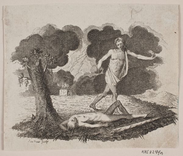 Curator: This is William Blake's engraving, "Colinet Mocked by Two Boys, from The Pastorals of Virgil," made in 1821. What springs to mind for you when you see it? Editor: It’s intense. A stark black and white contrast; a scene flickering between comedy and something much darker. The figures almost seem trapped in this small space, hemmed in by the thick, oppressive trees. Curator: Blake certainly packs a lot of emotion into these miniature landscapes. Remember that this was a commission for a printed book of Virgil's pastoral poems. Blake was meant to illustrate idealized rural life. Editor: But look at how he depicts them. Those aren't jolly peasants; they’re laborers etched into the landscape itself. The ink seems scrubbed into the paper, the lines thick with sweat and toil. There is labor implied in that paper and the engraving too. How it's made affects what it means. Curator: You are right about the figures he portrays: far removed from Virgil’s idealized vision, Blake depicts harsher realities in line with his own social convictions. I am deeply struck by the way the figure of Colinet gestures. It's an offering and a supplication all in one, fraught with a sense of injustice. I imagine Blake saw echoes of societal mockery and misunderstood genius here. Editor: Yes! It really speaks to the political turmoil in England at the time. Blake's process here isn't just aesthetic, it's a political act, turning a commissioned work into social commentary. This is about more than illustrating verse; it's about illuminating the human cost. Curator: He used such limited material - ink and paper and the copper plate to imprint it- to craft such an enduring world that we could ponder hundreds of years later, isn’t it fascinating? Editor: Absolutely. Considering what has endured versus the labor it conceals encourages my commitment to reassess traditional values. Curator: Agreed, thinking about Blake now makes me want to rush back to my writing desk with new perspective. Editor: And it certainly invites me to view artistic commissions through a more critical lens, beyond the finished product.