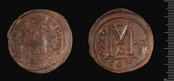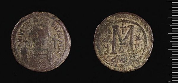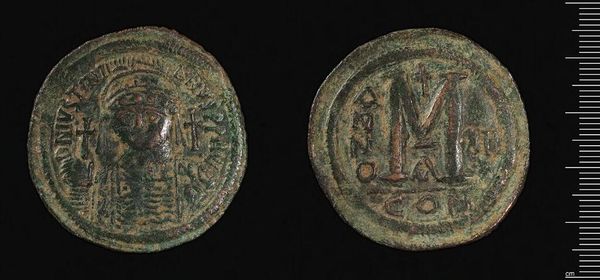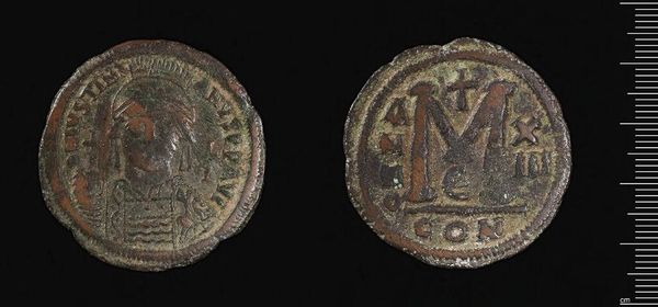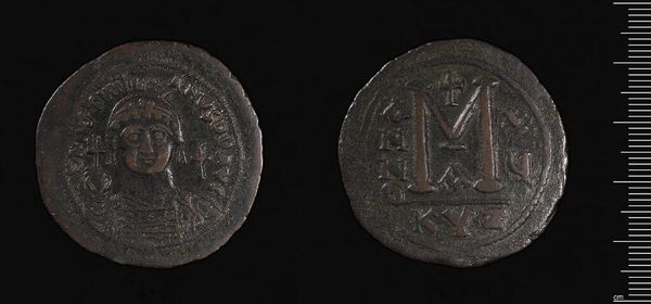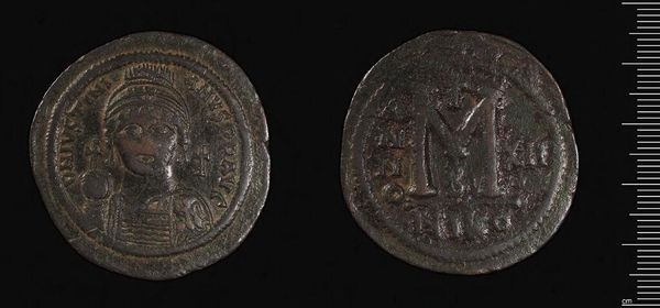 Editor: Here we have a bronze coin, attributed to Justinian I. The imagery feels quite powerful and imposing. What can you tell us about the socio-political context? Curator: This coin served as propaganda, reinforcing Justinian's power. The cross and inscription invoke divine favor, legitimizing his rule and imperial ambitions within a Christian framework. How might this representation have affected the daily lives of ordinary people? Editor: It's fascinating how a small object can carry such weight. I hadn't considered how it blended religious and political power so explicitly. Curator: Indeed. Examining art through an intersectional lens reveals how intertwined power, belief, and identity are within material culture. Editor: I'll definitely consider that in my future studies. Thanks for sharing your expertise!