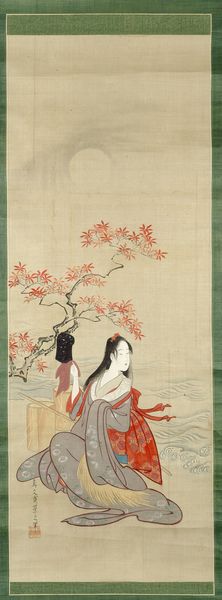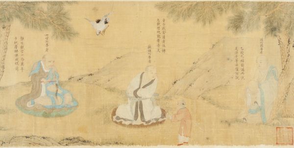 Curator: Before us is an intriguing painting titled "Two Ladies in Foreground of Landscape." The piece is from China, dating back to the Ming Dynasty, specifically 1368 to 1644. It now resides at the Metropolitan Museum of Art. Editor: My first impression is one of muted elegance. The warm, earthy tones of the watercolor almost blend into a single layer, giving it a feeling of serene domesticity. I'm curious about the material—it looks like silk. Curator: Indeed. The use of watercolor on silk was a refined, albeit less durable, choice, reflecting the values placed on delicate aesthetics within the scholarly and courtly settings. Editor: This subtlety is fascinating, isn’t it? Unlike grand landscapes meant to inspire awe, the scale and composition feel much more grounded, more...intimate. The presence of these two figures dominates, and I keep wondering about their relationship to each other and to their society. Curator: It raises important questions about women's roles within that social framework. Were they from the literati class, engaging with the arts and cultivating aesthetic appreciation? Their clothing may reveal something about their relative status, in comparison to the environment they inhabit, too. Editor: Definitely! Look at the contrast. The way the red and green in their garments stand out against the tan monochrome of the backdrop points towards the use of pigments. You know, I wonder where they would source colors. I wonder if they made them themselves, what the division of labour and time looked like? Curator: Pigments like these were indeed significant markers of economic means and access. The intentional depiction here subtly acknowledges that division and underscores a culture of trade in colours themselves. Editor: It feels less like a grand statement and more like a glimpse into the everyday experience and status, all wrapped up in a visually harmonious package. What do you think the role of the museum is in contextualizing pieces that rely so much on a sense of everyday nuance? Curator: It’s a crucial responsibility. We're tasked with peeling back those layers of cultural context, inviting a contemporary audience to understand these works not just as art objects but as documents reflecting the power structures. This then fosters dialogue, and ideally, makes way for change. Editor: That makes you consider everything differently, doesn't it? It brings us back to considering the historical conditions surrounding its production to question the means by which we preserve our material culture. Curator: Absolutely.