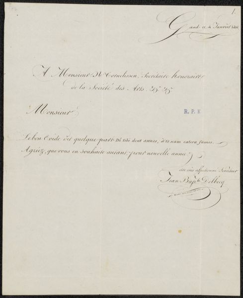 Curator: This is a fascinating piece – a membership certificate, "Lidmaatschapsbewijs van M.C.M. van der Vliet-Uitenhage de Mist," likely from 1839, originating from the Rijksakademie van Beeldende Kunsten. It’s executed in ink on paper. Editor: Immediately striking is the elegance of the script. The balance of the dark ink against the cream paper creates a strong visual hierarchy and evokes a sense of restrained formality. Curator: Absolutely. Think about the artisanal labour involved here. It’s not just the calligraphy itself, a highly skilled craft, but the preparation of the ink, the sourcing of the paper – elements easily overlooked when focusing solely on the artistic 'creation'. The document's existence signifies both institutional power and a recognition of a specific person’s contribution. Who was M.C.M. van der Vliet-Uitenhage de Mist, and what sort of network did that membership open up to her? Editor: The flow and rhythm evident within the swirls of each letter point to deliberate intention, yet maintain a natural organicism, so to speak, that tempers the geometric regularity typical of standardised documents. This combination is very aesthetically pleasing, drawing my attention toward those delicate hairlines as much as the bold downstrokes. I like that juxtaposition of order and freedom! Curator: Right. Considering the paper's materiality: its probable rag content indicates high status, emphasizing the Academy's importance in 19th-century Dutch society. Consumption patterns dictated access. The act of inscription with expensive ink turns mere paper into an instrument reinforcing class structures and cultural hierarchies. Editor: It reminds me also that semiotics considers a visual element, such as a calligraphic signature or printed seal, functioning to communicate messages, assert authenticity, and ultimately, solidify structural meanings or hierarchical placement by confirming validation with its visual elements and language. Curator: It prompts a reassessment beyond aesthetic judgments and more to explore the conditions that permitted this work's material existence and enduring appeal. Editor: Yes, this gives a rich insight into society and status through a piece of calligraphy!