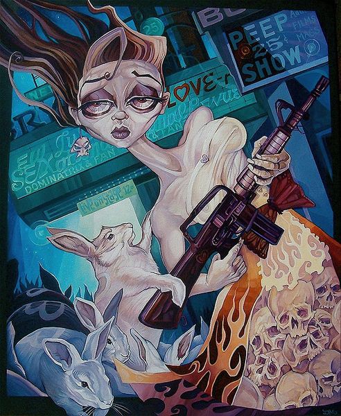 Dave Macdowell’s "I Am Woman" is rendered with bold acrylic paint and a playful eye, it’s a riot. The way he lays down color feels intuitive, like he’s figuring it out as he goes, which I totally respect. The texture is smooth, almost like a graphic novel, but there’s a definite handmade feel. I love the pinks and reds, how they clash and sing at the same time. Look at that wine glass, the way it catches the light. It’s not about perfection; it’s about energy. The line is loose and free, creating these cartoonish figures. It reminds me a bit of some of Phillip Guston's later work, that same willingness to embrace the absurd. Ultimately, Macdowell reminds us that art is a conversation, a back-and-forth between intention and accident, and that’s where the magic happens.