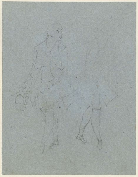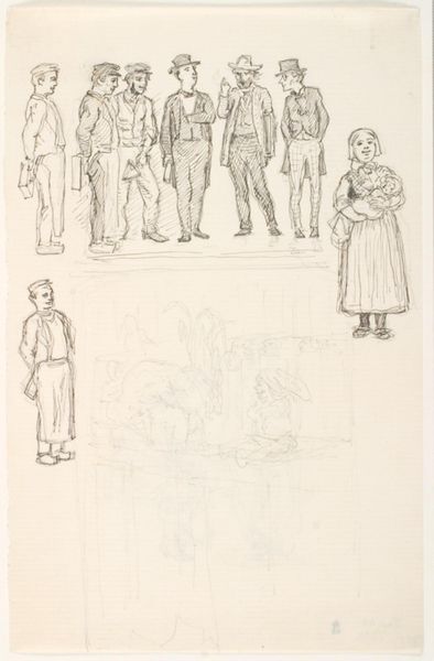 Curator: This intriguing pen and pencil sketch is titled "Illustrationsudkast til H.C. Andersen, Peiter, Peter og Peer" by Lorenz Frølich, created between 1866 and 1870. Editor: My first thought? It’s ephemeral. Fleeting. Like catching a glimpse of a memory. The faint lines give it a sense of unfinished narrative and fragile social interactions. Curator: Indeed. Frølich was deeply involved in illustrating Nordic mythology and fairytales. Andersen’s stories, of course, were enormously popular. It is part of a fascinating body of work within 19th-century Danish illustration traditions and reflects Andersen's influence in Danish society at the time. Editor: Exactly. The characters almost float within the frame, without much substance—literally rendered through thin lines. Their posture betrays a certain upper-class, almost performative, social code. I'm immediately drawn to the dynamics and the hidden hierarchies between these figures, rendered in such a starkly simple way. Who holds power in this interaction, and what is that power built upon? Curator: These draft-like sketches also tell a lot about the artistic process. Here, the narrative isn't set in stone. It is up for debate and exploration. It reflects, for me, a tension between national romanticism, realism, and a bourgeoning sense of the social space through narrative illustration. Editor: Agreed. And that artistic decision opens avenues for discussion. It forces viewers to project their interpretations onto the figures. They become malleable symbols, easily fitting into a discussion around power, class, and social identities, even today. I would suggest this element allows an intersectional understanding. Curator: Looking closer, we can clearly see how the artist revised lines, experimenting with positions and expressions. The sketch as a format becomes a playground of imagination and artistic choice in a broader art historical scope. Editor: A testament to the stories we tell ourselves, constantly rewritten and reinterpreted across generations. The act of looking at the sketch then, turns into a questioning of the tales, and those in power that perpetuate or negate the narrative over time. Curator: Yes, precisely. It leaves us pondering about the relationship between artist, story, and society then and now. Editor: Thank you. It has certainly prompted a reflection on how stories shape our understanding of the past and influence our present.