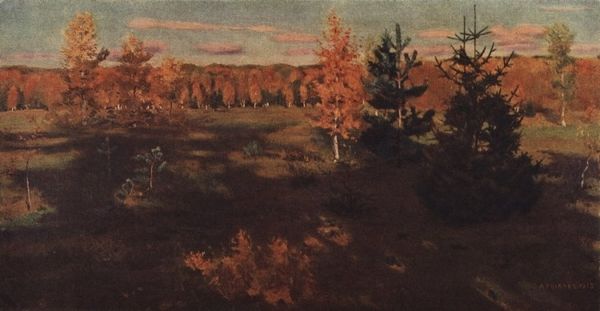 Editor: Here we have Theodor Kittelsen's "Askeladden og trollet (på flya)" from 1910. It seems to be an oil painting. There is a real sense of foreboding and drama created by the looming troll and the figure fleeing across the landscape. How do you interpret this work in terms of its historical and cultural context? Curator: This image is steeped in Norwegian folklore. Kittelsen often drew upon traditional tales, and here we see the intersection of nature and the supernatural. Consider how the troll, a creature of the wilderness, can be seen as a metaphor for untamed forces. In what ways does Kittelsen reflect anxieties about the encroachment of civilization upon nature? Editor: That’s interesting! I hadn't thought of the troll representing the power of nature itself. Is the fleeing figure, Askeladden, then representing humanity in conflict with it? Curator: Precisely. And consider the romantic era in which this was created. Artists were often exploring themes of national identity. Does the use of folklore serve to reinforce a specific cultural narrative? Also, note the dynamic contrast. One still like nature, the other in motion representing the future and/or modernity. What implications arise from this dichotomy? Editor: So, Kittelsen might be exploring deeper themes of cultural identity, change and conflict through this seemingly simple folklore illustration? I am also stuck on how the figure of the Troll and that of Askeladden both belong to the culture the image arises from, a culture of myths and oral storytelling. How are we to place that? Curator: Absolutely, and by looking at the artwork, not merely as an illustration, but as a cultural artefact, we begin to see it engage with larger discourses about power, identity, and the relationship between humanity and its environment. Also the relationship between its past traditions and future progression. Editor: I hadn't thought about how Kittelsen's choice of subject connects to those broader social and political ideas. I will definitely approach these artworks differently now. Curator: Art opens our minds when we situate its subject within the culture it arose from and its values and belief systems, and ask these pertinent questions.