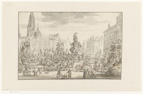 This anonymous print, "Dorpskermis," captures a village fair, a scene brimming with life, yet also laden with enduring symbols. Dominating the scene is the church, its spire reaching skyward, a symbol of spiritual order. Juxtapose this with the revelry below—drinking, dancing, and earthly pleasures. This dichotomy is a recurring motif in art, mirroring humanity's eternal struggle between the sacred and the profane. The motif of communal celebration echoes across centuries, from ancient Roman bacchanals to Renaissance festivals. The act of gathering, drinking, and merry-making taps into a deep, collective memory. The village fair, with its blend of piety and revelry, reflects the cyclical nature of life itself—a rhythm of work, worship, and release. The print serves as a mirror reflecting the viewer's own subconscious desires and fears. Like a dreamscape, it invites us to confront our own relationship with pleasure, piety, and the passage of time.
