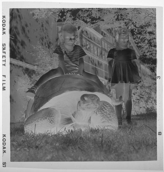Editor: This intriguing black and white photograph, simply titled "Untitled (boy riding on large tortoise)" by Jack Gould, shows exactly that – a boy atop a giant tortoise. What strikes me is the texture of the negative itself, and the almost ghostly quality of the figures. What do you make of it? Curator: The photograph’s materiality is key. Consider the labor involved, from the chemical processes of developing the negative to the physical act of printing. The "Kodak Safety Film" border becomes part of the narrative. It prompts questions about the means of production and the consumer culture that supports it. Editor: So it's not just about the image, but about the film itself as a material object? Curator: Precisely. It asks us to consider the social and economic context in which this image was created and consumed. Editor: That's a perspective I hadn't considered. Thanks for the insight!