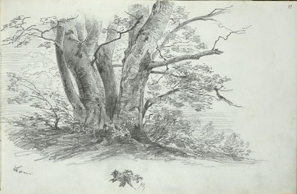 Curator: The Tate presents William James Müller's wash drawing, A Roadside, Leigh. Editor: There’s a haunting quality to this sepia landscape, it feels burdened by the weight of the trees that dominate the scene. Curator: Müller was fascinated by nature. Given his short life, he used his time to document the English countryside, just before industrial expansion changed it irrevocably. Editor: Observe how the trees lean away from the figure on the path as if guarding a secret, or perhaps the figure is struggling against the symbolic weight of the past that is holding them back. Curator: Müller created this as more than just documentation; it speaks to how the English saw themselves at the time, and the changing relationship with their natural resources. Editor: A landscape both beautiful and a bit melancholy, echoing the fleeting nature of time and memory. Curator: It definitely leaves us contemplating the price of progress.