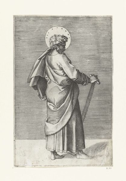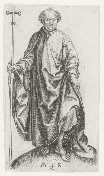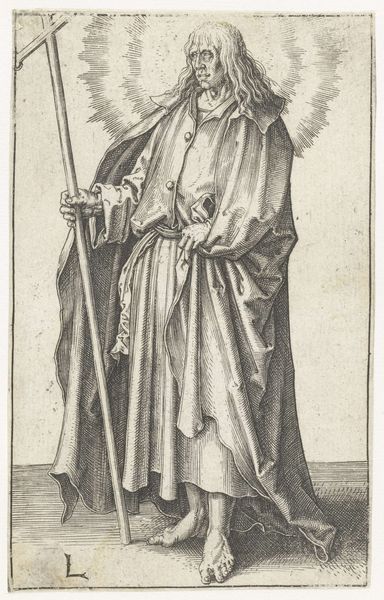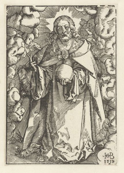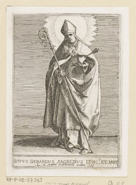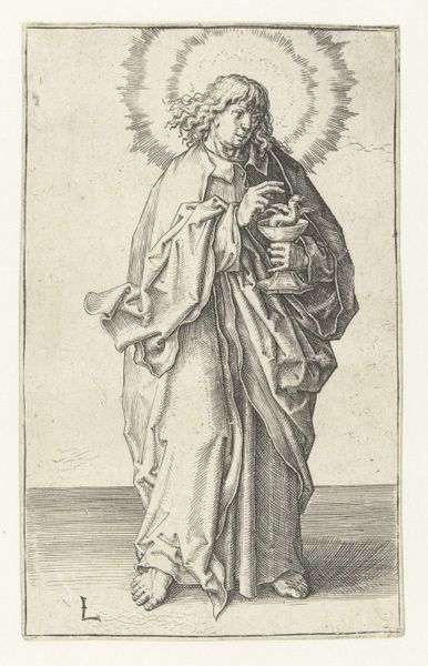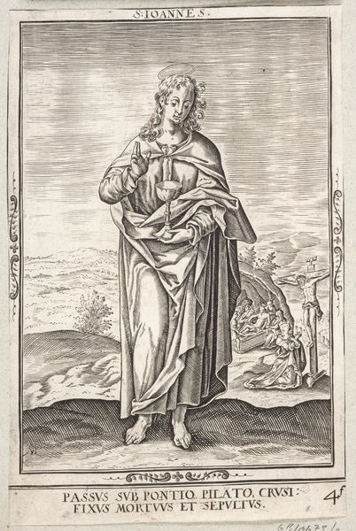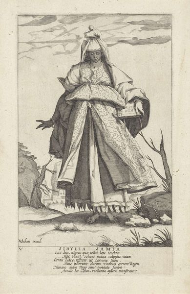 Curator: My first thought is how much this image looks like an illustration from a storybook, or maybe a medieval manuscript brought to life. It's an engraving, all sharp lines and careful details. Editor: And with that storybook feel in mind, let's delve into some context. Here we have a print, from 1578, made by Philips Galle. It's titled "Portret van Geertruida van Saksen, gravin van Holland en Dirk V", depicting Gertrude of Saxony, Countess of Holland, and Dirk V. Curator: So, a power couple portrait! Except he's a kid. Was that...normal? The way he’s holding onto her cloak feels oddly protective given the apparent age gap, or maybe that's just what happens when someone of the day has to rule. Is that what we are really looking at here: power? It seems cold and unmotherly somehow. Editor: In many ways it is, but we also need to recognize that portraiture back then, especially for royalty and the elite, wasn't about capturing some casual moment of familial love. These images served to document lineage, dynastic strength, and status. Gertrude, as Countess, had a vital role in ensuring the continuation of power through succession. Even with someone this young. The symbolism, the regalia, it all works to assert authority. Think about that ornate cloak, heavy jewelry, the little feathered hat! Each communicates power and lineage in a time of both prosperity and political unrest. Curator: All very stiff and formal and calculated...still! Is there space for Gertrude? A real human being and perhaps not a prop in the play of masculine strength? We’ve only been looking at the painting in terms of Dirk and the dynasty! Editor: A key aspect of Mannerism, which strongly informs this piece, is how it flattens perspective. See how the background recedes so minimally? It all funnels back toward Gertrude. Galle presents her not as a woman but as an immutable signifier of power and influence within a very specific historical moment, a figure larger than the individual person who actually lived. That actually seems rather subversive, doesn't it? Curator: Absolutely. The piece is powerful, both technically and conceptually. There’s something inherently political in choosing a mother and son to center authority. Editor: For me, the appeal lies in those meticulous details, rendered with the care that could only make something feel both immediate and of a different era all at once.