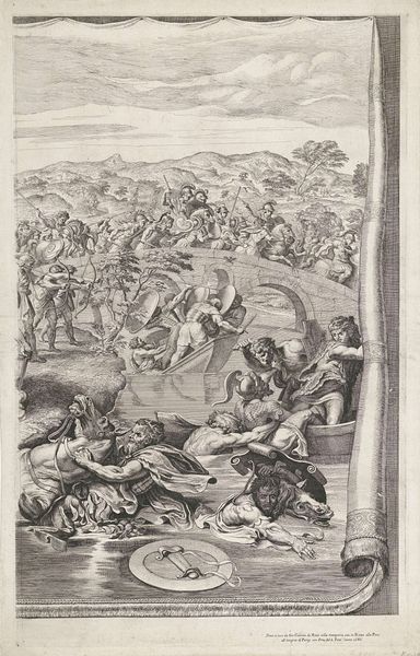Curator: What a compelling and chaotic composition. It practically leaps off the page with its density and dramatic arrangement. Editor: Indeed. This is the title print from Book 2 of Antonides van der Goes's "De Ystroom" (The Y River), created in 1671 by Romeyn de Hooghe. It's currently held in the collection of the Rijksmuseum. De Hooghe was a master engraver; his works provide insights into the cultural climate of the Dutch Golden Age. Curator: The texture achieved through the engraving is remarkable. Notice the contrast between the tightly packed figures in the lower half and the relatively sparse upper register. It creates a dynamic push and pull. And those fine lines—the burin work gives form and depth so that we can even see that some characters are partially submerged in the water. Editor: Water is indeed central. Given the book's focus, "De Ystroom" being about the River IJ. Consider the river god at the center, presiding over a teeming mass of humanity and mythic creatures. Water nymphs peek up to survey all of the commerce, trade and, frankly, history associated with the IJ. The IJ, you see, functions almost as a vein to the lifeblood of Amsterdam. Curator: Fascinating. But looking at just the composition, observe how the receding lines create a sort of implied space, or stage almost. Are we invited into the proscenium here to reflect on figures from Roman Triumph perhaps or some aquatic themed theater design? Editor: Undoubtedly, those elements were top of mind in the Dutch Golden Age. Those iconographic details, like the trident carried by the river god, and those putti playfully bearing the city’s symbols overhead; those motifs build layers of meaning onto both Amsterdam’s trade power and ancient history, and create both a statement of wealth and a self-aware sense of authority. Curator: So it becomes more than just an illustration. It functions almost as a symbolic program within a structured frame. A Baroque semiotic device, really! Editor: Precisely. It’s this convergence of formal elements with layers of embedded cultural memory, isn't it, which renders it such a captivating piece. Curator: A work like this demonstrates how crucial understanding structure is in making art come alive. Editor: And equally how understanding art requires understanding of cultural values to decode its depths.