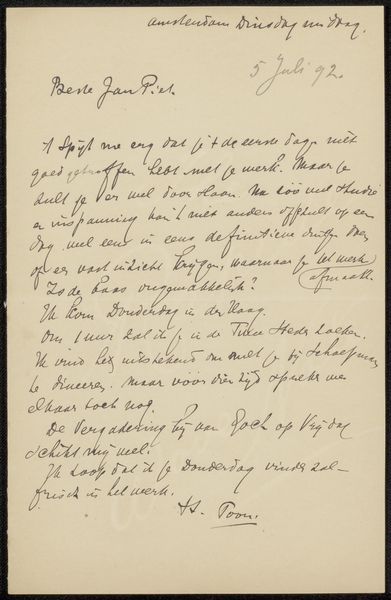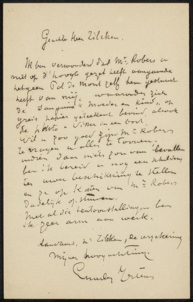 Curator: Antoon Derkinderen created this piece, "Brief aan Jan Veth," sometime between 1874 and 1925. It's an ink drawing on paper. The text certainly dominates. What’s your initial response? Editor: It strikes me as incredibly intimate. There’s a sense of immediacy, like stumbling upon a deeply personal thought captured in ink. The frenetic handwriting gives a vulnerable peek into the writer’s state of mind. It’s almost like witnessing private dialogue, maybe between lovers, the flow is erratic as the ideas jump. I imagine its impact lies in exposing human vulnerability through an ephemeral and informal act of correspondence. Curator: Indeed. I see an unguarded quality as well, almost as though we are intruding on something not intended for public viewing. What’s so beautiful about this is, here's the artist at his most raw—laying down what is really going through him. You see so much intention with a finished artwork, but pieces such as this one offer an unfiltered vision of what the artist thinks as the creative spirit consumes them. Editor: Exactly. We are invited into a kind of back-stage arena, a raw liminal space between idea and articulation, the potential power dynamics in artist collaboration between sender and receiver—are both parts active agents here, is one exerting control through withholding, or is this pure act of love where private intentions mirror a profound understanding? The penwork's fluidity is remarkable; the language creates a narrative, though elusive. There's beauty in both the legibility and illegibility. Curator: Yes, I concur—legibility is present, if limited. I find myself looking at it more as mark-making than writing, even though they can't be decoupled. Each stroke reflects the force, rhythm, and speed with which the hand traveled to construct the message—not necessarily the content, the material process itself! The artist employs dark and light shades that add both depth and emotional charge. Even when deciphering individual words feels impossible, the cumulative effect still feels compelling. Editor: It truly underscores art’s communicative capacity beyond words. We are looking into the embodied language inscribed by gender, class, history and desire to form the identity of this exchange. How it functions on a deep, instinctual, emotional register makes it all the more provocative and open-ended. It prompts deeper questions. Curator: Agreed, its lasting impact arises in that constant cycle of uncertainty where feeling and interpretation meet, forever changing each other. It's in moments of exchange such as this that meanings evolve. Editor: Absolutely, seeing Derkinderen’s artistic intention unfold creates not just an intellectual engagement but a deep emotive awareness which brings you closer to its truth and understanding.