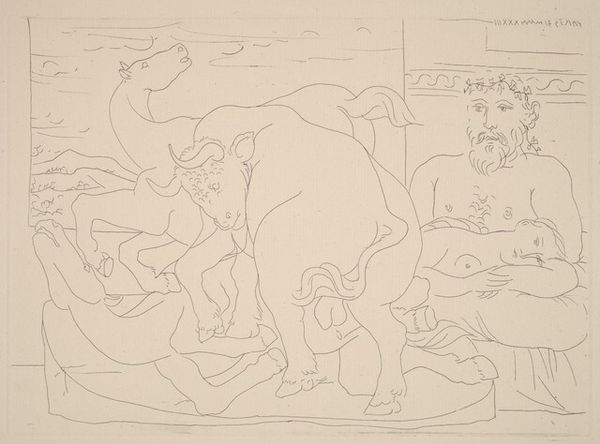 This is Picasso's "Sculptor at Rest III," an etching on paper. The graphic nature of this piece is so matter-of-fact. It’s like Picasso is sketching right onto our eyeballs. Look at the languid lines defining the figures. The sculptor reclines, almost bored, while his model lies nearby, and two horses rear up. All rendered with this casual, almost nonchalant line, scratched into the plate. What gets me is how those etched lines aren't precious. They're like thoughts, quick and fleeting. The texture of the paper peeks through, reminding us it's an image, not reality. I keep coming back to the sculptor's hand, raised almost in a gesture of dismissal. It's as if he's waving away the very scene he's created, acknowledging the absurdity of it all. Like Philip Guston, Picasso isn’t afraid to just put it out there, to show the raw bones of the creative process. It makes you realize art doesn't always have to be polished. It can be messy, playful, and wonderfully unresolved.