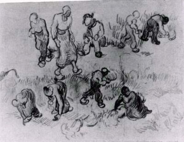 Vincent van Gogh created this drawing of a "Peasant Woman, Stooping between Sheaves of Grain" using a black crayon. Van Gogh had a deep and abiding respect for rural laborers which stemmed from his own sense of being an outsider. His decision to depict a woman, specifically, stooping to gather grain elevates her labor and highlights the social realities of rural life in the late 19th century. There is an undeniable intimacy in the drawing, Van Gogh captures the physical strain and perseverance required of these workers. This piece departs from traditional representations by focusing on the often-overlooked realities of working-class women. Van Gogh challenges the viewer to consider the humanity and dignity inherent in even the most physically demanding labor. "Peasant Woman, Stooping between Sheaves of Grain" prompts us to reflect on the lives and experiences of those whose work sustains society. The drawing is a potent reminder of the human cost of labor, and it invites us to recognize the value and importance of every individual's contribution.