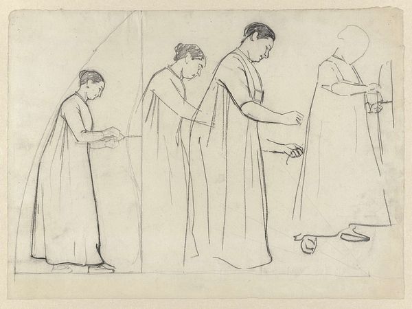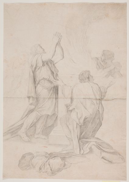 Editor: Here we have Edvard Sonne's 1826 pencil and engraving, "Scene af Tobias` Historie," housed in the SMK. It feels very classical, almost like looking at a frieze on a Greek temple, but it’s just a sketch. It's deceptively simple, what do you see in it? Curator: Ah, Tobias! This piece sings to me of a quieter Neoclassicism, a whisper rather than a shout. Notice the spareness, the almost hesitant lines – Sonne isn’t interested in bombast here. I see a tender domesticity struggling to emerge from the strictures of the style. Are they embracing or just yearning to? That to me is the soul of this piece, don't you think? Editor: Absolutely, there's something understated about the emotions. I wouldn't immediately guess it’s from the bible. So the unfinished nature... is that part of the point? Curator: Perhaps. Or maybe Sonne saw something holy in the attempt itself, the striving to capture grace. Think of it as a half-remembered dream – beautiful in its fragmented state. We see through the veil a glimpse of familial reconciliation. Does it matter that it is biblically founded, so long as we all understand reconciliation, regardless of our upbringing or faiths? Editor: I guess the raw, unfinished style actually heightens that sense of intimacy. Curator: Precisely! It allows us to enter the scene more readily, doesn’t it? What a clever little trick, perhaps unintentionally of course, to feel included. So often the classical style feels aloof, detached. Here we’re invited into the drawing room – or perhaps into the very heart of Sonne’s artistic process. Editor: That's given me a completely new perspective on what Neoclassicism can be. I had never looked at it that way before, almost unfinished but relatable. Curator: It does have its allure and is worthy of exploration and contemplation for what it can be versus our expectation of the style.