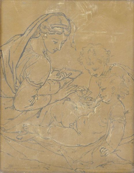 Pierre Puvis de Chavannes made this sketch of two women and a child with graphite on paper. De Chavannes was working during the second half of the 19th century, in a period where traditional academic art was being challenged by avant-garde movements like Impressionism. The artist's classicizing style can be interpreted as an attempt to connect with enduring values and universal themes, but also, to some, a way to evade the pressing social issues of his time. The grid overlaying the figures suggests that this drawing was a preliminary study for a larger composition, probably a mural. The figures of women and children often symbolize ideals of motherhood and domesticity in art, but also raise questions about the roles assigned to women. While seemingly traditional, the muted tones and simplified forms also hint at a modern sensibility, capturing a sense of timelessness. As you contemplate this sketch, think about how de Chavannes navigates the tension between tradition and modernity, and how these representations connect with our current understanding of identity, gender, and the politics of representation.