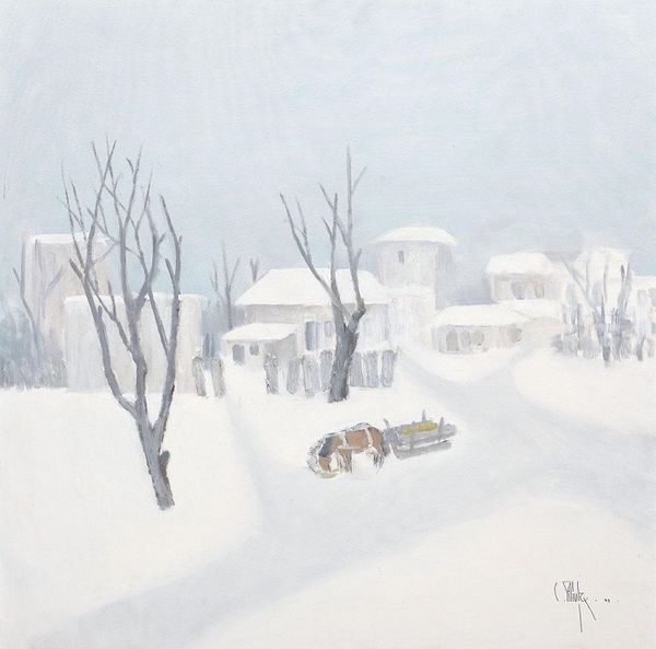 Constantin Piliuta made this Winter Landscape using oil paint, a traditional material, to capture a scene likely familiar to many during his lifetime in Romania. Look closely, and you'll see how the materiality of the oil paint itself influences the appearance of the work. Piliuta applied the paint in thick, opaque layers, building up a sense of depth and texture. The brushstrokes are visible, particularly in the foreground, creating a tactile quality that invites us to imagine the cold and snowy conditions. The paint's inherent qualities of viscosity and opacity also allow Piliuta to convey the heaviness of the snow-laden landscape and the muted light of a winter day. The artist's choice of oil paint, and the way he applied it, speaks to the long tradition of landscape painting. But Piliuta’s direct, somewhat simplified approach to technique gives the painting a humble quality. It is a scene of everyday labor, showing us that even a traditional fine art material can become a testament to the realities of life.