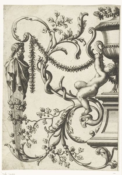 Curator: Right, let’s consider this intriguing print, “Twee halve panelen” – Two Half Panels. It's an engraving that comes to us from somewhere between 1682 and 1734, attributed to Jean Lepautre, here in the Rijksmuseum. What’s your initial read? Editor: It feels incredibly ornate, almost claustrophobic. There’s so much detail packed in – swirling foliage, human figures emerging from the designs. It has a kind of theatrical excess. Curator: Absolutely. Lepautre was influential in the development of Baroque ornament. Prints like this weren't necessarily viewed as standalone artworks. Think of them more as pattern books for artisans – providing inspiration for furniture makers, sculptors, and interior decorators. These images shaped the aesthetic of the era. Editor: So these panels were never really “halves” meant to complete a bigger scene. It seems, with the presence of the sphinx-like figure and the satyr-esque man on opposite panels, Lepautre is playing with deeper symbols? A dichotomy of the mythical realm, perhaps? Curator: I'd agree that there are some cultural values layered there. While artisans looked at designs like this with a functional view, the popularity of the "grotesque" style from the early Renaissance onward—mixing classic, pagan imagery with foliage—shows how flexible classical imagery still was for new messaging. Editor: It's interesting to consider that the symbolism would resonate and perhaps reinforce the era's cultural identity, not only dictate practical skills. Those leafy motifs themselves, repeated endlessly, become powerful signifiers. Even the very act of decorating with such lavish detail—the political messaging of the decorative programs of Versailles would suggest such. Curator: Exactly. Even in printed form, designs like these contributed to a shared visual vocabulary. They weren’t neutral; they helped articulate power and social standing. Thanks for expanding the semiotic scope here. Editor: And thank you. It really brings home the realization of how artful the cultural sphere was, how it always leaves room to be read and to evolve.