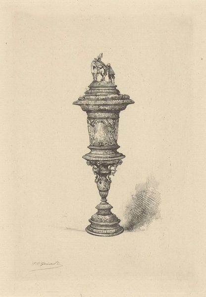 Johan Conrad Greive created this etching of the Silver Cup of the Haarlem Guild of St. Martin. Its intricate detailing is achieved through a complex network of lines, commanding our attention. The cup's structure, with its tiered divisions and elaborate ornamentation, plays with semiotic notions of status and tradition. Greive, in his choice of monochromatic tones, invites us to interpret the interplay of light and shadow which gives the metal cup a sense of volume. Notice how the verticality of the cup is contrasted with the horizontal etching lines in the background which subtly destabilize our perception of depth and space. This formal strategy invites viewers to consider the cup not only as a symbol of status, but also as an aesthetic object whose meaning is generated through the relationships between its various parts.