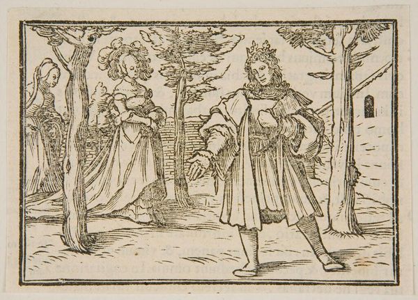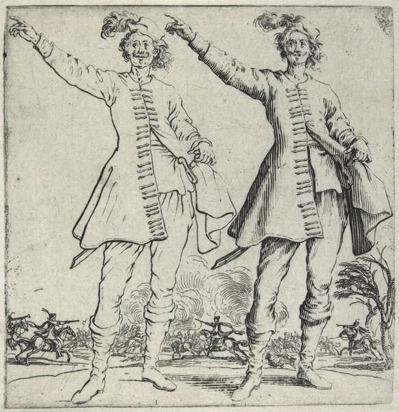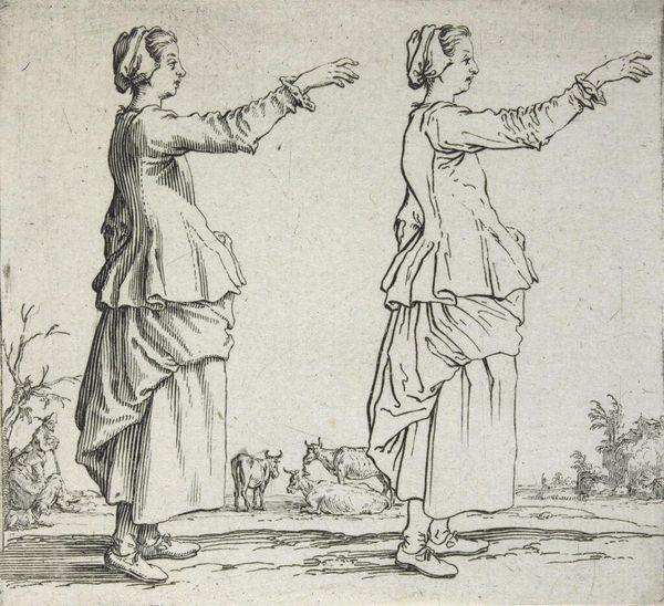 Curator: Here we have Jacques Callot's etching, "Peasant Woman with a Basket on Her Head, Seen from the Front." It's quite small, only about 8 centimeters square. Editor: She looks burdened, doesn't she? Yet there's a certain grace in how she carries that weight. Curator: Absolutely. Callot was fascinated by the lives of ordinary people. Note how the printmaking process allows for the mass production and distribution of this image. Editor: Mass production, yes, but also such intricate detail! I feel like I could step right into her world, smell the earth, hear the market bustle. Curator: These prints made art accessible beyond the wealthy elite. They were part of a growing culture of visual literacy and consumerism. Editor: It's amazing how a humble etching can reveal so much about work and life itself. Thank you for shedding light on all of this. Curator: A pleasure! Callot gives us so much to think about, doesn't he?