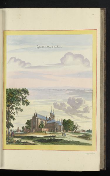 Albert Levone made this unnamed gouache on paper wallpaper design sometime between 1870 and 1910. The blues, greens and browns feel earthy, stable, like the colors of the natural world and our place within it. The paint is opaque, so we can't see through the layers. This emphasizes the texture of the paper and the way the gouache sits on its surface. I'm drawn to the way Levone uses thin washes of brown in the buildings, creating depth, and how the green of the trees is almost stippled to suggest light filtering through the canopy. It’s interesting how the scene almost looks like a stage set. This feels connected to the work of other pattern designers like William Morris, and the emphasis on craft and beauty in everyday objects. To me, this piece shows how something functional can also be deeply imaginative.