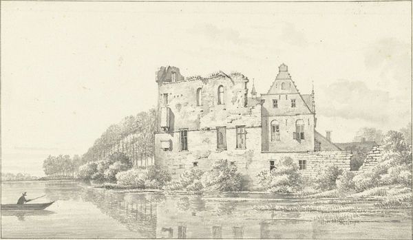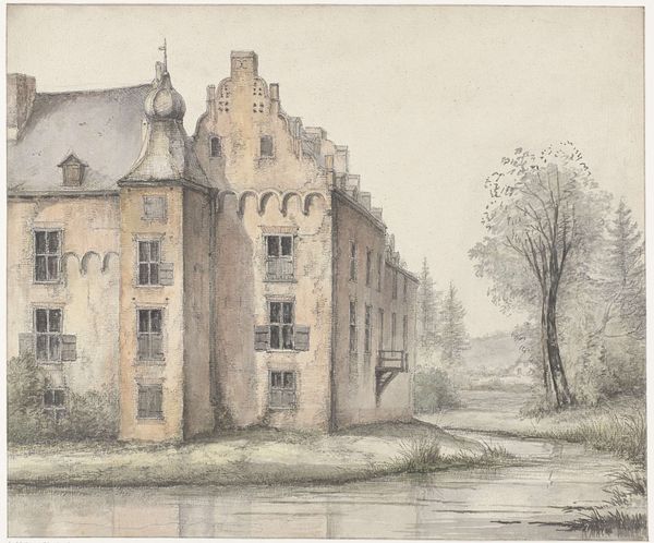 Editor: This painting, "Buildings by a Canal," from the 17th century, is currently housed at the SMK in Copenhagen. It appears to be done on wood, in a monochromatic palette. It feels very grounded, almost architectural in its rigidity. How do you interpret this work? Curator: Given its creation in the Dutch Golden Age, and the use of wood, I'm drawn to the painting's relationship to craftsmanship and production. Consider the labor involved in preparing the wooden support. Was it locally sourced? Did that accessibility shape the artist's choice? What can it tell us about wealth and available commerce routes? Editor: So, you're thinking about where the materials themselves came from? I hadn't considered that! Curator: Precisely. The Dutch Golden Age was a period of intense global trade. Was this wood a common material easily accessible, making art creation easier and cheaper? How does using this readily accessible support affect art production, and perhaps lead to the popularity of genre painting, landscape or architectural painting like this one, which depicts a very upper-middle-class setting. Does its being monochrome simplify production too? Editor: I see your point! The widespread availability of a material could drastically influence the art being created. What about the lack of color? Was that a constraint or choice of artistic interpretation? Curator: It would suggest that perhaps, at least for this artist and piece, monochrome artwork could suggest an intended consumption by people in specific locations/situations or be aimed toward different demographics and/or economic standing compared to those art pieces created in full polychrome painting during this period. The question of choice always raises the more intriguing query of available means. Editor: This is fascinating. Thinking about the resources involved really opens up a whole new way of understanding the painting's context and possibly its accessibility too. Curator: Absolutely. It pushes us to consider art not just as a product of individual genius, but as a tangible artifact shaped by material realities.