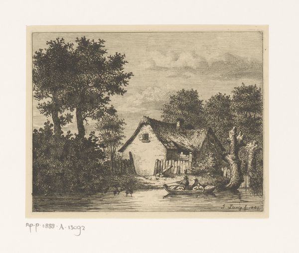 Editor: So, here we have Jean Théodore Joseph Linnig’s 1849 etching, "Grenspaal van Antwerpse jurisdictie in Dambrugge"—a boundary marker in a small cityscape. It has this quiet, almost melancholic feeling. What strikes you most about it? Curator: Well, it's fascinating how Linnig situates this border marker within a seemingly tranquil, even picturesque, scene. It compels us to think about what these "borders" really mean, historically. Who benefits from them? Who is excluded? Editor: That’s a good point. It feels almost unremarkable until you really consider it. Curator: Exactly. The boundary marker itself is a symbol of power and control, quietly asserting authority. Consider the act of demarcation in the 19th century, as nationalist ideologies gained traction and colonialism expanded. Mapping, borders, jurisdiction - they all reinforce systems of power. Can you see any implicit tension here? Editor: Hmm… the dog seems to be going outside the boundaries. Maybe the boundary is more fluid that we expect? Curator: An astute observation. Boundaries are never as fixed or absolute as those in power would have us believe. It encourages critical consideration of how landscapes become sites of negotiation, resistance, and control. It encourages questions about class, belonging, and ownership. Editor: This etching initially seemed like a simple depiction of a place, but you’ve helped me realize it speaks to much bigger social and political ideas. Curator: Art is so important because it prompts these critical reflections. This is so much more than just ink on paper; it is about the historical construction of place and power!
