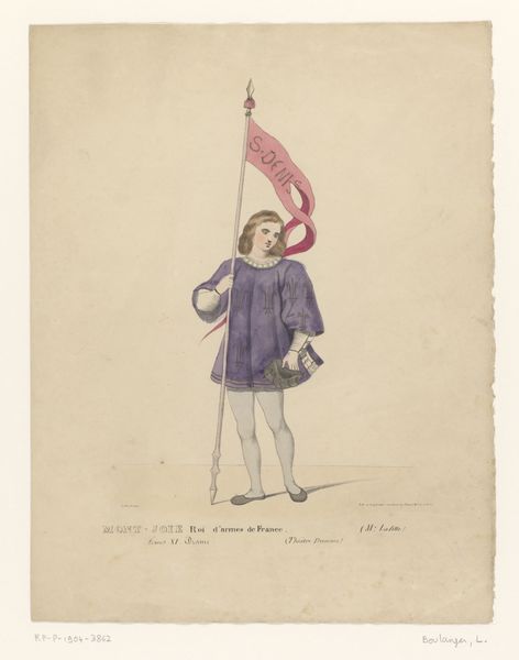 Curator: Standing before us is a vibrant watercolor titled "Kostuum van Quentin Durward uit het drama Louis XI à Péronne" by Louis Boulanger, created in 1826. Editor: Immediately, I see this striking figure with a plaid slung over his shoulder, and the confident bird perched on his gloved hand. It gives an air of noble detachment, yet I can sense some level of narrative intention due to its relation to a play costume design. Curator: Absolutely, it's from a play! Boulanger captured this character, Quentin Durward, for a performance of "Louis XI à Péronne." His skillful watercolor strokes and careful attention to detail bring the costume to life, particularly that striking blue coat. It shows such promise and dynamism in its aesthetic elements. Editor: The choice of watercolor lends a delicacy, almost like a memory fading. Look how Boulanger juxtaposes the solidity of the costume—the sharp angles of the plaid, the crispness of the coat—with the airy, almost ethereal wash of the background. And do we think the pale hose of this "romantic" hero contributes to its intended design? Curator: Undoubtedly, every element plays its part. Boulanger was a prominent figure in the Romantic movement and embraced emotion and drama; indeed, there is some level of sensitivity there through Durward. This costume design serves as an example of Romantic ideals applied to visual arts, showcasing Romantic themes in contemporary design as well. It's meant to elicit emotion and connect us with a distant historical and creative time, in all its intensity! Editor: It's a compelling blend of strength and fragility, a vibrant flash of theater history preserved on paper, almost two centuries later! Curator: Agreed; thank you for sharing your sharp insight! The layers that the Romantic period provides are almost impossible to exhaust. Editor: Thank YOU! Seeing how plays come together adds another layer of artistic admiration to our museum visits!