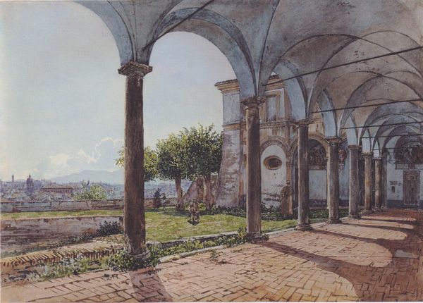 Curator: This watercolour from 1841, entitled "Ruins of Diocletian at Split," was painted by Rudolf von Alt. It offers a view of the ancient palace courtyard, teeming with details of daily life amidst the decaying architecture. Editor: It feels melancholic, almost like looking at a sepia-toned photograph, even though it's a watercolor. The contrast between the solid ruins and the soft sky is really striking. Curator: I find Alt's romantic treatment of the scene particularly interesting. Look at the placement of the figures – strategically arranged, but seemingly unaware of the grandeur surrounding them. The ruins stand as a testament to a fallen empire, whilst these genre-painting details position everyday life as continuous, yet subordinate. The architecture isn’t really the primary theme, in that sense. Editor: The ruins themselves have a certain symbolism though. Arches, columns… these aren't just architectural elements; they signify power, empire, and, ultimately, transience. Even the soft colours add a layer of memory, of the past bleeding into the present. Note also the use of light here to emphasize that narrative. Curator: Precisely. Alt captures the weight of history but also implies questions. Who gets to experience it, and how does the burden of history interact with contemporary experience, and especially, how do social hierarchies affect the way we look back to it? These ruins have always been contested spaces that continue to generate intersectional questions. Editor: What really intrigues me is how these symbols, particularly in an 1841 setting, tap into collective memory. Diocletian, known for persecution and authoritarianism, ironically left a lasting architectural legacy. Von Alt, then, is reminding viewers of these visual connections, and how symbols are continuously repurposed and re-signified across historical narratives. Even something as simple as an arch represents triumph, which continues resonating even through architectural fragmentation. Curator: It makes us confront our relationship with historical symbols – the weight they carry, but also the continuous opportunity for reinterpretation. Editor: A subtle yet powerful piece about the interplay between past and present, memory and decay. Curator: Yes, and the social layers that determine who gets to decide how the past lives on.