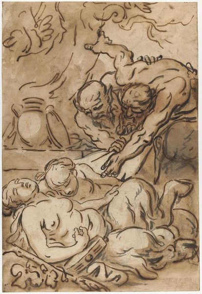 This is a copy of Goya's "Gran disparate", made by Tomás Joseph Harris. It presents a scene dominated by grotesque figures, with one individual pouring liquid into the mouth of another, while a veiled figure looks on. Such imagery echoes motifs found throughout art history, from ancient rituals of offering and sacrifice to the darker aspects of the medieval Danse Macabre. Consider, for instance, how the act of pouring liquid carries both life-giving and destructive potential, reminiscent of libations to the gods or potions brewed by witches. This recalls the image of the Cronus devouring his children, embodying primal fears of consumption and decay. The emotional weight of this image lies in its unsettling portrayal of human vulnerability and the cyclical nature of life and death. The composition evokes a sense of unease, engaging viewers on a subconscious level with deeply ingrained anxieties. These symbols are not confined to a single era or interpretation. They resurface, evolve, and take on new meanings, demonstrating the non-linear, cyclical progression of cultural memory.