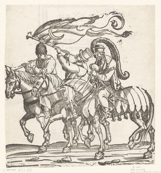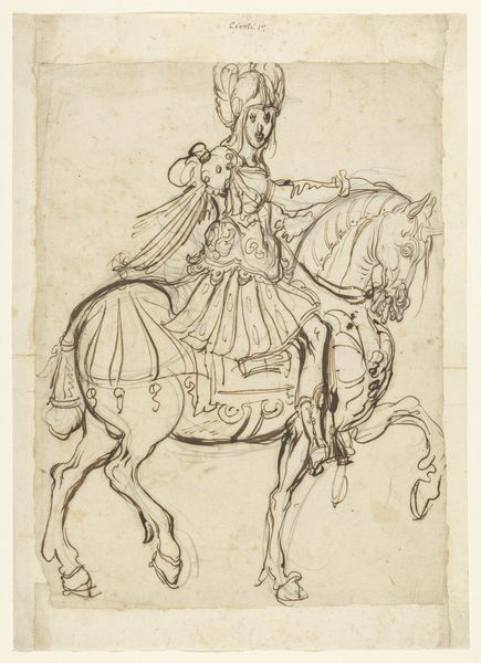 Curator: Here we have Antonio Tempesta’s “Bradamante,” an engraving from 1597. At first sight, one gets the immediate sense of power; the warrior seems poised and commanding atop her steed. Editor: It feels staged, somehow. Like a Renaissance cosplay photoshoot, you know? All the elaborate costume detail... it's striking but almost fantastical. It does remind me of reading Orlando Furioso, full of such characters. Curator: Absolutely, it aligns perfectly with Mannerist sensibilities. Note the emphasis on elegance and stylized form, even in something that alludes to military prowess. It’s not about raw force, but controlled, almost theatrical presentation of strength. Look how the lines create a dynamic texture, a rich interplay of light and shadow despite the simplicity of the medium. The texture gives so much depth. Editor: Yes, the engraver’s detail is quite intense— the horse seems to almost writhe under the armor, despite the controlled pose of the rider. All those fine lines suggest real weight, real metal… or maybe just the illusion of it all. I imagine what this was made for: did these have a function, beyond their aesthetic one? Who purchased these, I wonder? Curator: That is the fascinating intersection of form and cultural function. Such prints often served as visual emblems of virtue, historical allegories intended for display but were collected, bound into books or framed as individual images of role models. Here, we see the celebration of Bradamante, valorous and heroic. Editor: "Bradamante Valorola" the print tells us! It has that grand air of, dare I say, propaganda. I get lost wondering about her intent in her faraway stare, though. I suppose if she is a knight or Amazon, intent should be fixed somewhere far beyond what lies in my imagination! Curator: Indeed. That focused gaze, the pointing gesture, directs us beyond the immediate frame, urging us to follow her vision. A symbol, as any work of art! Editor: Right. That really makes one consider all the elements and textures in terms of purpose—a real semiotic framework. Thanks! Curator: My pleasure, what a rich piece for reflection and exploration. Thank you!
