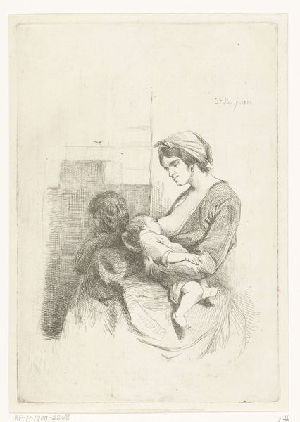 Editor: This is "Moeder met kind op haar schoot," or "Mother with child on her lap," a drawing by Ernst Willem Jan Bagelaar, sometime between 1798 and 1837. It’s done in ink on paper, and I’m struck by its simplicity. What’s your take on this piece? Curator: It’s interesting to view this through the lens of the Romantic period. It emerged during a time of significant social upheaval, didn't it? The image of motherhood was really gaining cultural traction then. We can observe the way these social values permeated the arts and how artists often utilized universal figures like "mother and child" to tug at the heartstrings of society. What elements in the composition strike you as characteristic of its period? Editor: Well, the style is very pared down, focusing on emotion over detail. Also, both the mother and child seem pensive. The whole scene suggests an intimate, private moment, not something staged or heroic. Curator: Precisely. The use of a seemingly private scene to convey public emotion is quite central to much Romantic-era art. It invites reflection on the shifting role of family. Considering who Bagelaar was, and for whom might he have intended the piece, alters how we see this drawing. Was it for a wide audience, or a closed circle? Editor: That makes me wonder about how these drawings were consumed. Did they circulate among families, maybe as a sentimental keepsake? Curator: Quite possibly! Their display and circulation deeply impact our reading today. Museums now enshrine it, elevating it to art for the masses. The location of the artwork adds new significance to this touching portrait of a family. Editor: I never thought about how the journey of a work impacts its meaning so much. Thanks! Curator: It’s a constant dialogue! Thanks to you as well.