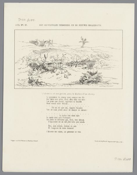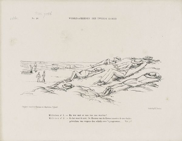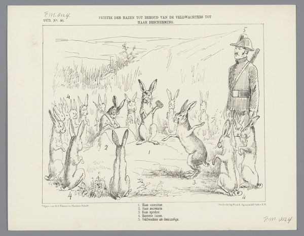 Curator: Let's look at "Spotprent op de angst in Amsterdam bij de doorgraving van Holland op zijn smalst, 1863," an etching by Johan Michaël Schmidt Crans. At first glance, the array of bunnies seems whimsical. Editor: They do! It's mostly monochromatic but active, restless—like a flurry of anxious energy captured on paper. Are they running from something? Curator: Exactly. This etching is a caricature addressing the anxieties surrounding the excavation of the Netherlands, depicted through these fleeing rabbits. Observe how the artist uses line work to convey frantic motion, exaggerating their features to emphasize fear. Editor: I find that so telling. Look how Schmidt Crans leverages these innocent creatures. Rabbits have often represented vulnerability and cowardice. They’re an easy target for ridicule and reflect the perceived weakness of those opposing the canal project. Curator: Absolutely, their flight embodies the resistance to change and fear of the unknown that often accompanies progress. And there’s an added layer in how it taps into historical tensions of land reclamation. The poem printed below directly addresses human hard labor and its comparison with animal digging work. Editor: Precisely, the textual context below anchors our interpretation, offering clues to understanding Dutch identity at the time. It’s a political piece but the seemingly childish subject matter renders it digestible for popular consumption. Curator: It demonstrates how political commentary was disseminated at a time when overt expressions could be met with disapproval. Editor: The artist is using humor and accessible symbolism to speak directly to the population’s fears, their resistance, and their agency. Curator: The stark contrast between the delicate lines and the weighty political context really enhances the print’s impact. It reminds us that even the smallest image can contain complex commentary. Editor: It also highlights how artists function as commentators in critical dialogues on political decision-making, often with wit and nuanced observation.