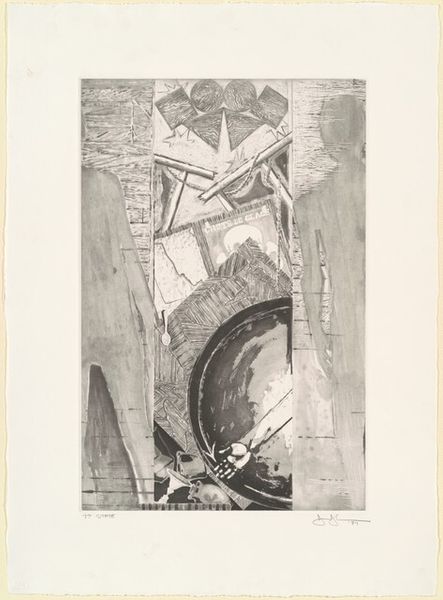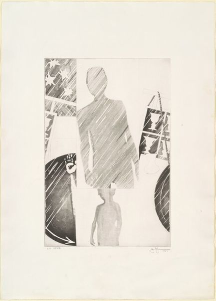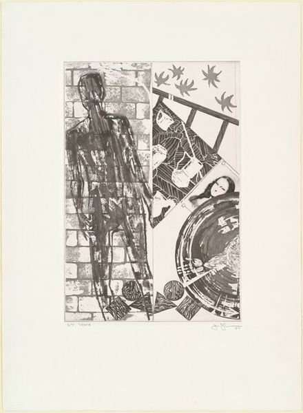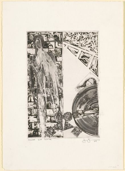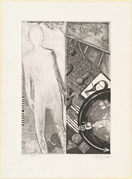 This print, titled "The Seasons (Summer)," was conceived by Jasper Johns. It’s a dense layering of images and motifs in shades of gray, a hallmark of Johns' artistic style. Note the figure on the left panel, partially obscured by what appears to be a brick wall. It echoes the classical contrapposto stance, a pose found in ancient Greek sculpture, embodying a sense of balance and potential motion. This pose has recurred throughout art history, signifying an idealized human form. Now observe how Johns distorts this classical ideal, fragmenting the body into a network of brick-like shapes. The emotional impact here isn't one of classical harmony, but rather a sense of alienation and disintegration. Consider also the sea horse; the American flag; the wheel; and the Mona Lisa, turned on its side. Symbols that have accumulated layers of meaning throughout history. Johns brings them together on one plane, inviting us to examine the cyclical way we perceive symbols, and how they are charged with personal and collective meaning.