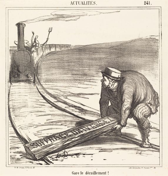 Curator: The artwork before us is Honoré Daumier's "Watch out for the derailing!" Editor: It's striking how Daumier uses stark lines and hatching to create such a palpable sense of disruption and imminent danger. Curator: Indeed. Daumier, throughout his career, used his art to critique political and social issues, particularly the French government. This piece seems to target those obstructing progress. Editor: The figure placing the obstacle on the tracks is rendered with such exaggerated features, it's hard not to see it as a caricature, and that obstacle bears the inscription "Suffrage Universel." Curator: Exactly. Daumier is commenting on the resistance to universal suffrage, portraying it as a deliberate act of sabotage against societal advancement. The steam train in the background then becomes the symbol of progress. Editor: The composition is brilliant. Our eyes are immediately drawn to the man and the heavy beam, but the approaching train adds urgency. It leaves you with a sense of unease about the future. Curator: Absolutely, and by understanding the context of Daumier’s work, we gain insight into the continuous struggle for democratic ideals and the forces that try to undermine them. Editor: A potent reminder that progress is never guaranteed, and eternal vigilance is required to safeguard it.