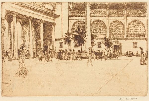 Editor: Here we have Joseph Pennell’s 1904 etching, "The Steps, British Museum." It depicts the iconic architecture with people milling about. There's something serene yet grand about the scene. How do you interpret the social dynamic captured here? Curator: It’s a fascinating depiction. Consider the British Museum in the early 20th century. It represented the zenith of British cultural power and its role in collecting and displaying world history. Pennell's etching doesn't just present architecture; it shows the public engaging with this symbol. Look at the figures: what social classes are represented? Are they interacting with the museum in a way that suggests ownership, reverence, or something else entirely? Editor: I see people of different ages, but it's difficult to determine social class from the sketch. It almost seems to democratize access to culture, showing the museum as a public space, like a park. Curator: Precisely! This speaks to the museum’s burgeoning role as an educational and recreational space for the public. But is that truly democratic? Consider what the museum itself represents – the spoils of empire, objects removed from their original contexts. Pennell presents a sanitized view, perhaps, downplaying the complicated politics inherent in such an institution. Do you think this imagery influenced how the public perceived their cultural institutions? Editor: That's an interesting point. It definitely created a certain narrative, a romanticized view of accessing high culture. It glosses over the museum's controversial history, portraying it more like a social hub. Curator: And that, perhaps, is the power of art: to shape public perception and subtly influence cultural values. Seeing how art depicts public engagement with cultural institutions can reveal more about a society's aspirations and the political role of those institutions than the artifacts alone. Editor: I’m rethinking what I initially saw as simply a pretty picture! It's a reflection of constructed ideals of culture and access. Curator: Exactly. By considering the historical and social contexts of an image, we uncover deeper layers of meaning.
