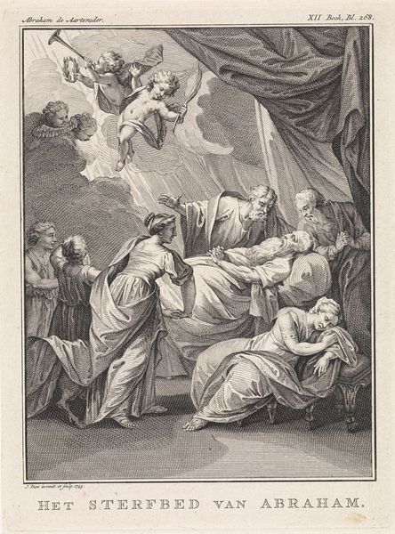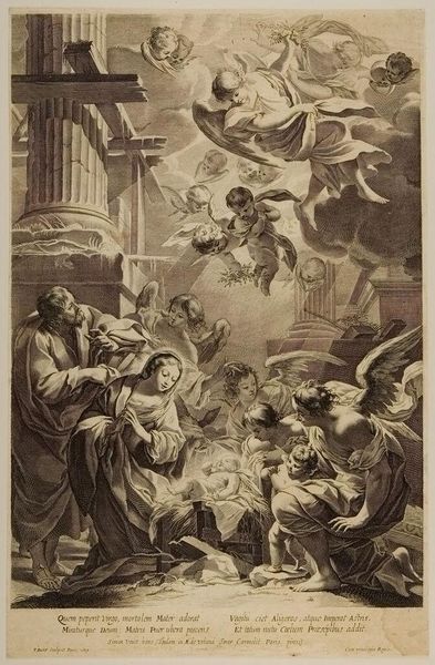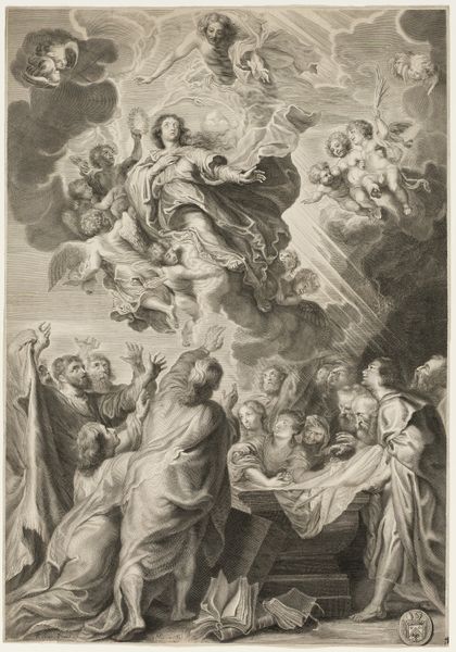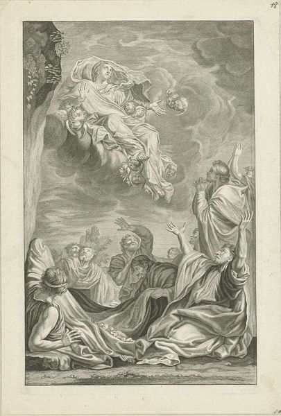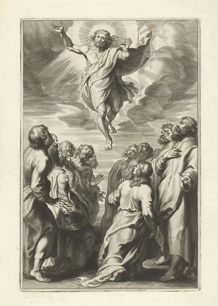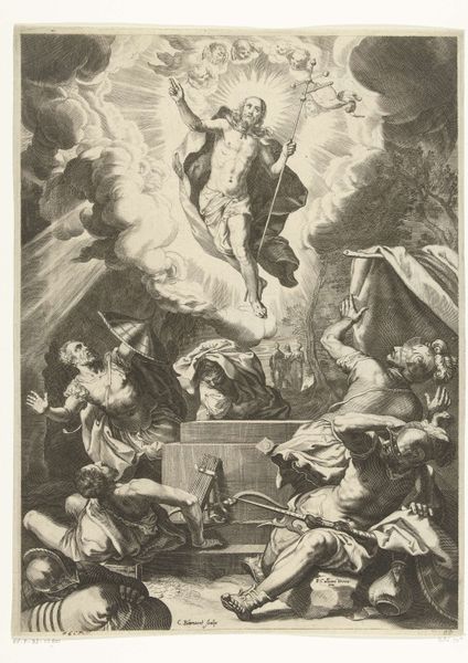 Jacob Matham created this black chalk "Annunciatie" on paper sometime around the late 16th or early 17th century. The composition is divided vertically, with the angel Gabriel on the left and Mary on the right, linked by a divine light cascading from above. Matham masterfully uses contrasting textures to create a sense of depth and drama. The angel's robes billow with soft, flowing lines, while the cloud beneath him is rendered with dense, swirling strokes, punctuated by the faces of cherubic figures. The linear quality of the engraving emphasizes the ethereal nature of the scene, juxtaposing the divine with the human. The light breaks down traditional notions of space, and the semiotic weight is clear: the lily symbolizes purity, while the gesture of Gabriel's raised hand directs our gaze towards the heavens, all components creating a structured narrative.