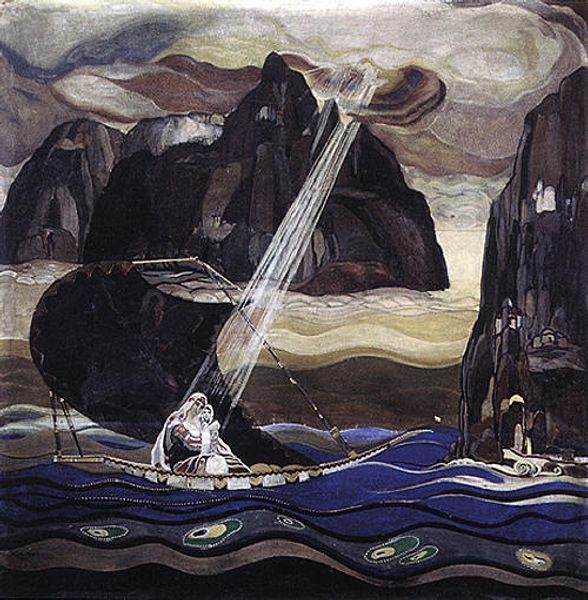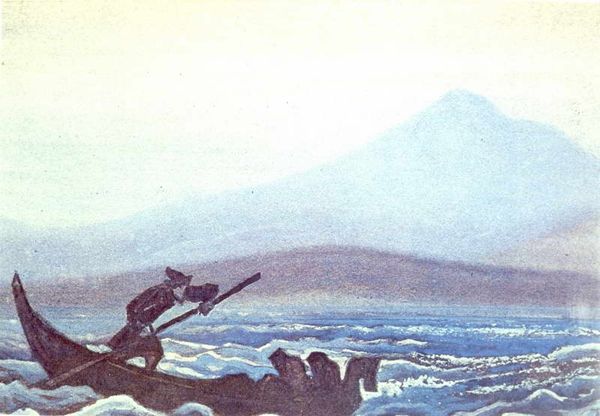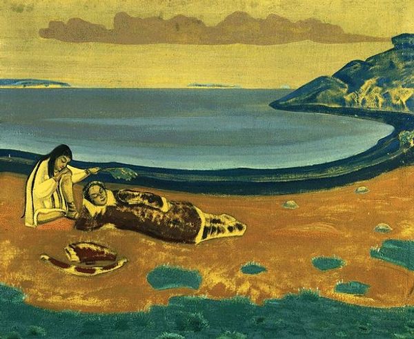 Editor: This is "Messenger from Himalayas," an oil painting made in 1940 by Nicholas Roerich. I am immediately struck by how the subtle colors evoke a sense of quiet mystery. What stands out to you? Curator: The materiality is quite interesting, especially when you consider Roerich's commitment to simplified forms. Look closely at the application of the oil paint. See how thinly it's layered, almost like tempera? This evokes earlier, pre-industrial modes of production. Considering the time, do you think this a conscious choice in contrast with increasing industrialization, a subtle reference to handcraft? Editor: That's a great point, it does feel very deliberately…primitive, almost. Could you expand on that idea about craftsmanship in relation to his broader style? Curator: Yes. Roerich’s landscapes often feature simplified, almost geometric forms, reminiscent of stage backdrops or even Byzantine icons. This flattening, combined with his use of seemingly archaic painting techniques, highlights a concern with the loss of traditional skills and a romantic idealization of pre-modern societies. This isn't just about aesthetic choice; it’s about the conditions of labor that shaped those choices. Consider where the materials originated. Were the pigments locally sourced or mass-produced? What social messages can you glean from his color choice and brush strokes? Editor: I see. So by looking at the process and the materials, we can see a statement about his values and the impact of industry on traditional life. Curator: Precisely. And it forces us to examine how those values are expressed through material and technique, rather than relying solely on symbolic interpretation. Editor: It definitely reframes how I see the piece, thinking less about a straightforward symbolic message and more about the tangible processes behind it. Curator: Exactly. The social and material circumstances surrounding the artwork production add layers of depth that enrich our understanding and change our interpretations.