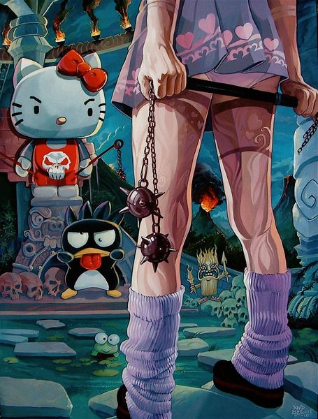 Dave Macdowell created this surrealist painting "Never Grow Up" in the 20th century, playing with familiar cartoon characters and unsettling imagery. At first glance, the work's vibrant colors and recognizable figures from childhood evoke nostalgia. However, this initial sense of innocence quickly unravels. Macdowell presents a distorted, almost grotesque version of childhood icons. These familiar characters are fragmented and reconfigured in ways that are disturbing, drawing a stark contrast between the perceived safety of childhood and the darker realities of adulthood. Note how the female figure at the center embodies a complex interplay of innocence and corruption. The doll heads she holds, and the meat theme could symbolize objectification, and the commodification of bodies. "Never Grow Up" challenges our sentimental views of childhood, and how beauty standards affect young girls. The painting also hints at the loss of innocence, and the often harsh transition into adulthood. It invites us to question the cultural narratives we construct around childhood, and the ways in which these narratives can both protect and constrain us.