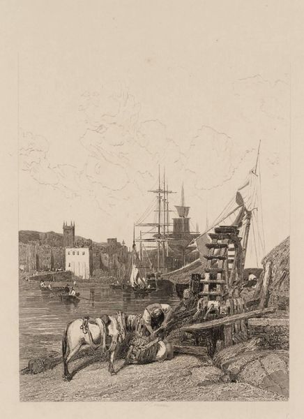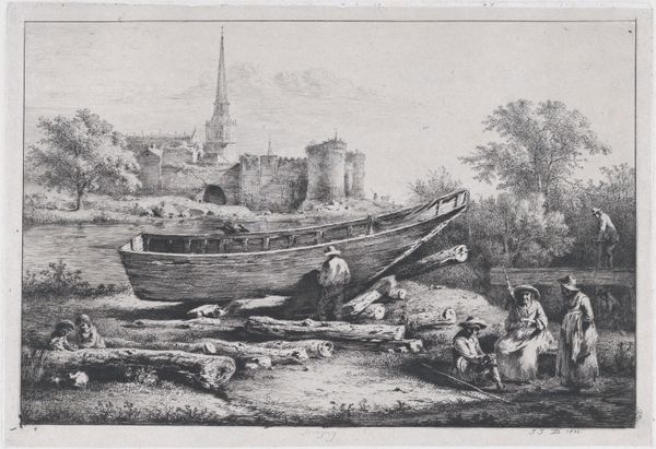 Curator: Here we have Jean Jacques de Boissieu's etching, "Boat in Repair in a Dock in Savigny." Editor: It feels like a stolen moment, doesn't it? A boat stranded like a whale, workers paused mid-task, all sketched in this wonderful grainy monochrome. Curator: Boissieu, active in the late 18th century, captured everyday life. Notice how the monumental architecture in the background dwarfs the quotidian scene in the foreground. Editor: Yes, but that contrast is the magic, isn't it? The grand cathedral looking down on these ordinary lives—a reminder of time's relentless march. I love the textures. Curator: His masterful use of line creates a palpable sense of atmosphere. The etching was likely part of a larger series documenting the region, reflecting the Enlightenment's interest in cataloging the world. Editor: Cataloging the world, yes, but also capturing its soul. Those resting figures, that boat's silent plea—it's more than just documentation. It's deeply felt. Curator: Indeed, Boissieu presents us with a tableau of labor and rest, a glimpse into a world on the cusp of change. Editor: Leaving us to wonder, what story will that boat carry next?