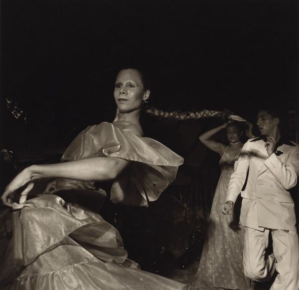 Editor: This is Larry Fink's "Studio 54, New York City" from 1977, a gelatin silver print. There’s an almost voyeuristic quality to it. Everyone seems caught in their own world. What stands out to you about this image? Curator: It's precisely that sense of fractured narratives that grabs me. Fink wasn't just capturing a party; he was documenting a moment of radical social collision. Think about what Studio 54 represented: a melting pot of identities – queer folks, artists, celebrities – all existing, often uneasily, in the same space. How does that intersectionality come across to you? Editor: I see it in the clothing and body language – such a mix of vulnerability and bravado. But what were the implications of this kind of representation? Curator: Exactly. Fink's lens isn’t neutral. He's implicating himself and, by extension, us, in observing these figures. It prompts us to consider: who has the right to document these spaces, and how does that documentation shape our understanding of these subcultures? Think about the debates around cultural appropriation and the male gaze. Where do you see those dynamics playing out here? Editor: I guess the image is very upfront and kind of exposes its subjects. It definitely complicates the romantic idea of Studio 54. Curator: Absolutely. It's about power, representation, and the gaze. And how those elements intertwine to create a historical record, a story open to continuous interpretation. Editor: I’ll definitely look at Fink’s work differently now. There's so much more going on than just a photograph of a nightclub. Curator: Exactly. Art can give us access to a nuanced and multilayered history of specific times and social phenomena.