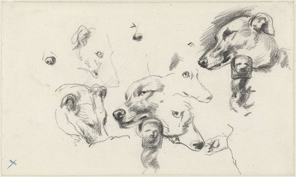 Editor: This is "Studies van Honden" by Guillaume Anne van der Brugghen, made in 1838. It's a pencil drawing with several depictions of dogs, a few rendered in more detail than others. It feels like a quick study, perhaps from a sketchbook. What stands out to you in this piece? Curator: The image, while seemingly a simple study, resonates with a cultural memory of companionship and nobility, doesn't it? Dogs, across centuries and cultures, carry such heavy symbolic weight. Think of Anubis in ancient Egypt, Cerberus guarding the underworld... or closer to the era of this piece, Landseer’s sentimental canine portraits reflecting Victorian values. What feelings or associations do these particular dogs evoke for you? Editor: I hadn't thought about it in that way. The way they’re collared makes them appear domestic. The detailed study hints that the artist found an affinity with the subject, giving a personal feeling as if they were pets. Curator: Exactly! Notice, too, the use of line. Loose, almost frantic in places, suggesting a vibrant energy, a fleeting moment captured. It speaks to a Romantic sensibility – finding the extraordinary within the ordinary. In essence, Brugghen isn't just sketching dogs; he is recording an emotional engagement with the natural world. Does that perspective shift your understanding? Editor: Definitely. Seeing them as part of a broader historical and emotional context makes the drawing feel more significant than just a study. Curator: Precisely. The symbol, charged by cultural continuity.