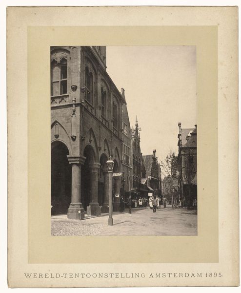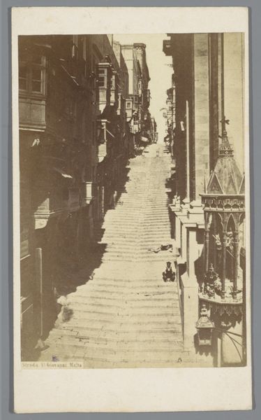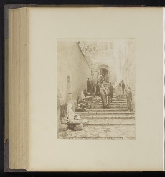 Curator: Fèlix Bonfils’ "Straat in Jeruzalem," likely created between 1867 and 1885, captures a slice of life in the Holy Land. The Rijksmuseum is fortunate to house this beautiful gelatin-silver print, but it was originally also made as an albumen print. What catches your eye initially? Editor: A powerful sense of stillness. Despite the implied activity of the street, it feels caught in amber, a relic of another time. It's visually compelling, though—the way the light spills down those steps... Curator: Light is pivotal here. Bonfils’ skillful use of light and shadow leads the eye, accentuating the architectural details and the textures of the stone. Notice how he uses the contrast to bring a feeling of depth to the scene, pulling you into the city. It's an Orientalist's perspective, carefully constructed for a Western audience, mind you. Editor: True, it’s not a gritty documentary; there is an element of romanticism at play. But consider the composition itself—the receding lines converging at the top of the street, punctuated by the minaret, act as strong visual cues. The symmetry is broken by the figures to give it the spontaneity it requires to look like a natural street. The photograph gains a peculiar balance. What are your thoughts? Curator: It makes me ponder the gazes – both Bonfils’ and ours. As viewers, we participate in this historical moment, but removed, changed. We see this captured slice, yet it holds an entire, complicated society in its frame. Each figure frozen yet full of life… The clothing textures, a play of light and darkness within each draped robe... Do you see how each person contributes something individual to this? This simple record allows all. Editor: The technical expertise Bonfils displays is not often praised enough. But you are right, there's a sense of narrative implied despite it still being static. Now that my attention has shifted, it really seems each face is like an unspoken question of ours, in an invitation to explore our preconceptions... Curator: Preconceptions or curiosities. This work whispers of a place and time we might never fully grasp, and in its quiet way, begs questions of what and who we notice, within the simple structure itself. It's history, art, and silent musing. Editor: Agreed. There's more than meets the eye upon first viewing. A rewarding experience if one pauses.