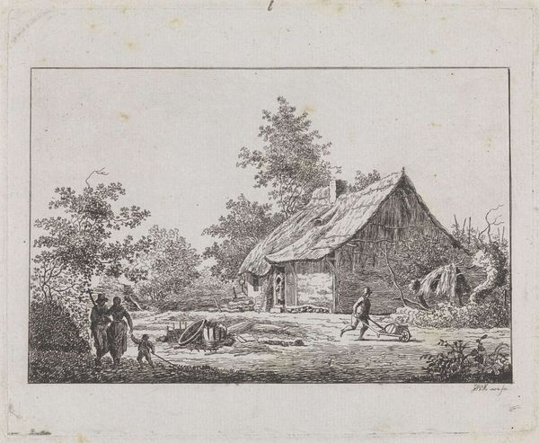 Editor: So, this drawing, "Boerderijen aan het water," or "Farmhouses by the Water," is by Remigius Adrianus Haanen, dating roughly from 1827 to 1894. It’s ink on paper, a landscape…it feels very grounded, solid. What strikes you most when you look at it? Curator: The weight of memory, certainly. These aren't just farmhouses; they are vessels brimming with lives lived. The thatched roofs, rendered so meticulously, feel like protective shells, shielding stories passed down through generations. Notice how the water reflects the structures – doubling their presence, embedding them deeper into the landscape and into our collective visual lexicon. What kind of cultural values are you thinking about when you view such pieces? Editor: That’s interesting. I guess I was just seeing the buildings as buildings, but you're making me think about how they represent family, community…stability. Curator: Precisely! Consider the prominent placement of the hearth, a universal symbol for domesticity and warmth. The artist understands the power of such imagery to evoke feelings of comfort and belonging, transcending specific location. Are there compositional choices, perhaps, that amplify that feeling for you? Editor: The way the farmhouse sort of anchors the composition, with the trees and water surrounding it, creating a sense of enclosure… I see it now. It feels very intentional. It really does seem to point to the continuity you were talking about. Curator: And how that relates to a particular idea of "home". It's fascinating how an image can hold so much emotional and cultural weight, isn't it? The longer one views these visual prompts, the deeper one's insight grows! Editor: Definitely. It’s much more than just a picture of a couple of farmhouses. Thanks for showing me that!