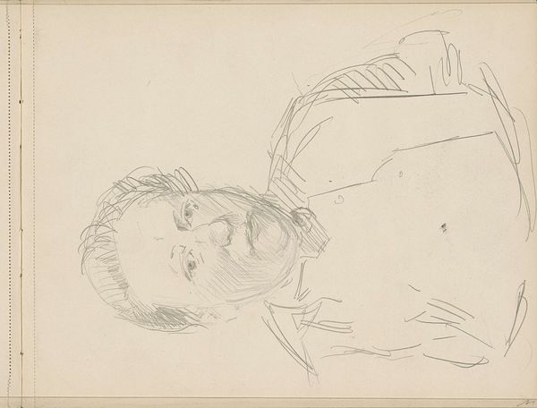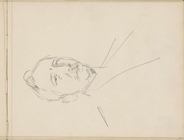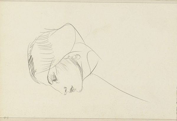 Curator: Here we have "Portret van een onbekende vrouw" by Isaac Israels. It is estimated to have been created between 1875 and 1934, made using pencil. Editor: It has the candid, immediate feel of a sketch dashed off in a moment. The lines are spare, almost skeletal, yet they suggest a presence. It evokes an incomplete narrative. Curator: Yes, the sketch offers us a glimpse into the artist's process, almost like a page torn from a personal sketchbook. Think of the women in the late 19th and early 20th century, many of whom remained anonymous and unrecorded, and consider how this sketch might represent a poignant meditation on their obscured realities. What can we infer from this representation? Does its incompleteness mirror the partial visibility of women of that era? Editor: I find the composition incredibly intriguing. The deliberate lightness of the pencil work and the bare minimum of shading – the almost absent shadows – serve to highlight the essential form. What does this tell us about Israels’ perception, and what does he want us to see? Is it about line? Structure? The reduction to the barest elements gives it power. Curator: It makes one ponder about the artist’s relationship to the model as well. How much agency did she possess, being immortalized—or perhaps, only momentarily captured—in this ephemeral sketch? The incomplete features are echoed with broader discussions on the societal positions afforded to women, as well as class dimensions related to visibility. Editor: But look closely—the looping quality to the pencilwork. It doesn’t have the rigid structure of academic draughtsmanship. I'm not sure he ever intended to come back to it. But the expressive quality of the lines makes this sketch transcend its subject; I am captured by the abstract quality. Curator: That abstraction opens up a broader socio-political question: whose stories are valued and fully fleshed out versus those that remain mere sketches? Editor: I see your point, there is this relationship to consider, as well as the aesthetic pleasure in something so raw and incomplete. Curator: Exactly. The piece certainly inspires critical introspection. Editor: And a careful looking through close visual analysis!