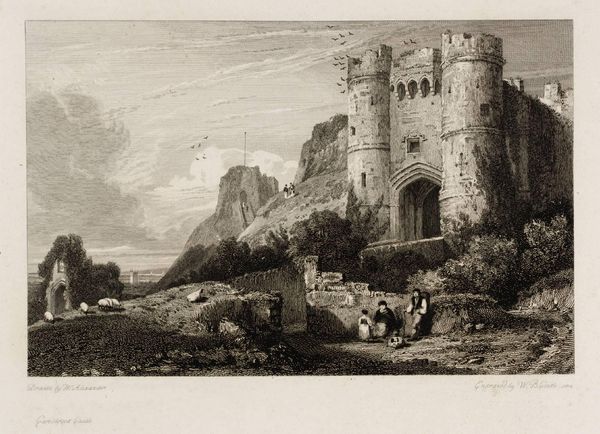 Curator: William Alexander's print, "Carisbrook Castle," presents us with an iconic view rendered with remarkable precision. Editor: There’s a rather melancholic atmosphere evoked through the monochromatic palette and delicate etching technique. The crumbling stone hints at lost grandeur. Curator: The artist's use of line weights is quite striking, isn't it? Observe the contrast between the castle's solid form and the wispy clouds. The formal qualities emphasize depth and scale. Editor: Indeed, but the castle itself! Carisbrook held Charles I prisoner—a potent symbol of broken sovereignty, its ruins laden with the weight of history. Curator: True, though I find the composition's formal balance equally compelling. The strategic positioning of the figures adds a human element to the scene. Editor: Those figures feel like echoes, mere witnesses to the castle's enduring saga of power and imprisonment, echoing across the ages. Curator: It's a reminder that even in ruin, the structure holds significance for those resting at its base. Editor: An evocative print, inviting us to contemplate both the formal artistry and the castle's rich, symbolic resonance. Curator: A testament to how formal technique can enhance the historical narrative.