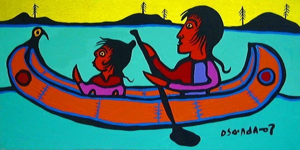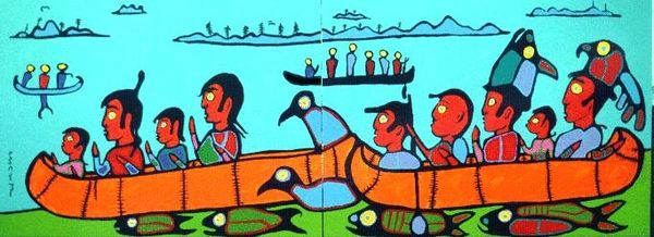 Curator: Right, let's dive in. Here we have "Migration From Siberia" by the influential Norval Morrisseau. Editor: Wow, the electric turquoise background really pops. There’s a beautiful simplicity to the composition but it does feel dense with meaning. Almost childlike in its construction, but not quite? Curator: Exactly, Morrisseau masterfully employs acrylic on canvas, flattening perspective in a way that's both profound and immediately engaging. Look closely at the boat. It becomes a vessel of cultural memory. Editor: A vessel quite literally teeming with life. I see people, of course, and then the fish below – beautifully rendered in vibrant greens. The whole scene makes me think about the labor of movement. This imagined journey by boat suggests repetitive gestures: paddling, steering… Curator: That sense of journey and labor resonates with Morrisseau’s broader narrative. Think about the forced migrations experienced by Indigenous communities, the historical traumas deeply embedded within their collective memory. And Morrisseau using these accessible materials is critical in democratizing the space for remembering. Editor: It also speaks to a very deliberate connection to tradition, wouldn’t you say? The simplification of form, almost into pictograms, suggests a reliance on traditional methods to transmit knowledge. The labor involved becomes a conscious act of cultural preservation. Curator: Precisely! Morrisseau’s works often blend personal experience with larger spiritual and cultural narratives. It's like he's giving form to intangible connections, allowing the viewer to become part of the story. Editor: What do you make of the use of black outlines surrounding each of the figures? I noticed a distinct flattening of each of the images included that isolates them from one another, making the individual distinct while contained within this symbolic migration… Curator: Absolutely. The outlines demarcate and highlight. These figures, afloat within the vessel that contains cultural narratives, remain distinct from one another while journeying together. Editor: Well, this was quite a voyage, wasn't it? Morrisseau offers a reminder that the most impactful statements are often articulated with clarity and the conscious deployment of available materials and resources. Curator: Agreed. There is something so disarming and deceptively simple, yet enduring in its raw honesty and spirit. This painting invites you in, doesn’t it?