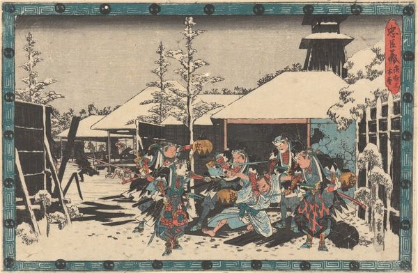 Curator: Here we have "Night Attack," a woodblock print in ink from c. 1843-1847 by Utagawa Hiroshige, found within the Minneapolis Institute of Art's collection. Editor: Brrr, just looking at this print makes me feel cold. All that snow, that huge moon, you can almost hear the crunch under their feet. The crisp detail—it really pulls you in. Curator: Indeed. Hiroshige captures the famous Ako vendetta, a pivotal event from 1703, steeped in samurai ethos, duty, and revenge, but presents it in the familiar ukiyo-e landscape style. Editor: Samurai as subject, but made for the masses. I wonder if Hiroshige felt a tension between these popular sensibilities and such a culturally weighty topic. Do you think the dramatic lighting plays on those heroic themes, Curator? Curator: Good question! Yes, certainly, I'd say. He's presenting it for popular consumption while carefully nodding towards historical painting. Think of that glowing moon, or the way he articulates this very still drama on the attack—quite romanticized when we account for the stark history of the event. Also observe how those very snowy pines in Japan serve the function of a classical, European frieze frame. It’s strategic in making the familiar alien and vice versa. Editor: Alien and familiar… Right! Because despite the snow and historical context, the layout of this scene seems so simple, you know? Action right up front, almost no depth beyond that middle ground. But what really stays with me is the movement. The warriors seem determined, but also so composed in spite of it all! It makes me think of some kind of… frozen ballet, somehow. The dog only adds more frantic motion! Curator: The choreography adds another layer to interpreting ukiyo-e beyond what meets the eye. He invites audiences to appreciate art as political statement. The figures become more dynamic and less stoic within this piece, even when it is a historical re-enactment. Editor: So much tension under a deceptively serene, snow-covered surface. I guess history and humanity can be so beautiful. Curator: Precisely. Night Attack isn't merely a scene, it is a dialogue, a dance between past and present, valor and its human costs.