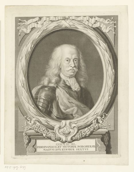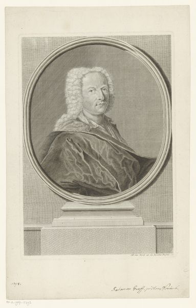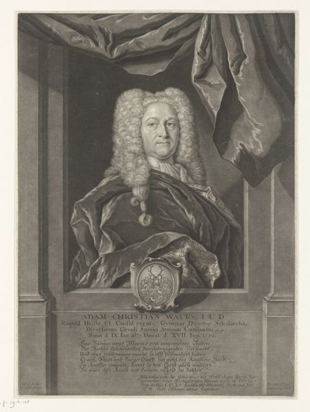 Curator: Ah, here we have an engraving titled “Portret van Georg Matthias von Selpert.” Bernhard Gottlieb Fridrich created this portrait sometime between 1742 and 1743. The texture almost looks like pencil strokes somehow. What is your first reaction to the piece? Editor: It’s...striking, isn't it? Very imposing, the wig practically roars, demanding attention. It’s a world of power distilled into monochrome lines. Curator: The baroque style really shines through, don't you think? It's like stepping into a historical drama—so rich, the ornamentation almost dizzying! What exactly is the focal point to you? Is it von Selpert's serious gaze or the sheer spectacle of status? Editor: Definitely a mix. It’s cleverly staged with the ornate frame, partially drawn curtains—he’s not just *in* the world, he's presented to us with deliberate theatricality. I mean, even his face, though realistic, seems sculpted, monumental. Look at the lines of the engraving; there is clear structure and precise tonal shifts in how they describe his features and convey the fabric’s folds. Curator: And the inscription! It details Selpert’s many accomplishments. So very important to immortalize all his roles. A window into a person, sure, but equally a symbol, almost archetypal, reflecting ideals of power and persona of that era. Editor: True. Think about what this work aims to preserve, not just an image but a legacy, a position in society. In this portrait’s graphic language, Fridrich not only immortalized Georg Matthias von Selpert, but the structures propping his reign. This is how the elite chose to visualize themselves—powerful, enduring, formidable. Curator: This makes one reflect on the value placed on legacy back then, this desire to shape how future generations see you. Perhaps a slightly sobering thought in our very digital, ephemeral age? It begs the question of what and who will we memorialize next? Editor: Indeed. Makes you consider what of value we pass on or consider permanent—I leave more pictures of my dinner on the Internet than carefully planned, meticulously etched versions of my being. Food for thought.