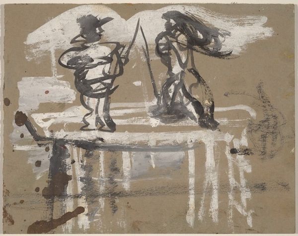 Cyprián Majerník created "Pri vode" using watercolour in an unknown year. The muted palette of browns, blues, and grays evokes a sense of melancholy. The composition is divided horizontally into thirds, with the upper portion dominated by a stormy sky, the middle showing the sea, and the lower section depicting land and figures. Notice the stark contrast between the dark, imposing figure of the horse and the more delicate, almost ghostly, figures of the humans. The horse can be seen as a symbol of raw, untamed power, while the humans struggle to control it. The loose, gestural brushstrokes add to the sense of movement and instability, reflecting the Expressionist style prevalent at the time. The interplay between control and chaos evident here can be interpreted through a lens of existential philosophy. The painting seems to question our ability to impose order on the world, suggesting a deeper, underlying sense of anxiety. As you move on to the next artwork, consider how artists use form and composition to convey complex emotional and philosophical ideas.