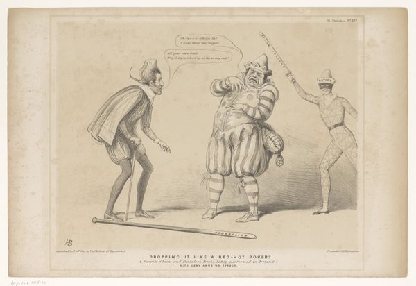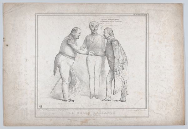 Curator: This drawing, “Spotprent met Roebuck en Lord Bentinck,” possibly from 1847, is by John Doyle and resides here at the Rijksmuseum. The artist rendered this image in pencil on paper. Editor: Well, immediately, I'm struck by how spare the lines are; the almost bleached tone of the paper amplifies a kind of raw, confrontational energy. It feels almost performative. Curator: Yes, "performative" hits the mark. Doyle was a master of political caricature, wasn’t he? Look at Roebuck, poised on that small step, his finger a weapon, projecting… Editor: But look closer at the hand – you can practically see the tool making these marks, the quick strokes suggesting fury or impatience, the artist capturing a fleeting moment in graphite. The social act of seeing and consuming, right? How was it circulated? Curator: Consider Roebuck’s extended hand, pointing emphatically toward Bentinck. The speech bubble shows an excerpt which satirizes contemporary oratory: he is positioned above the men he’s “lecturing”. The symbolism…Roebuck embodies this specific type of impassioned parliamentarian. Editor: Still, what kind of paper allowed Doyle such immediacy? I wonder if the drawing’s dissemination depended heavily on reproducing the initial pencil sketch using contemporary printmaking technology, like lithography? It's the process of reproduction itself that fascinates me. Curator: Precisely! This interplay of the hand-drawn image, the printing process, and the political content speaks to broader shifts in social discourse, really. These caricatures helped shape public opinion. The potency lies not just in what’s represented, but in how it reflects and fuels prevailing sentiments, wouldn’t you agree? Editor: Absolutely. By looking closely at Doyle’s choice of medium and reproductive possibilities we are looking at its time and can perhaps learn more about the print culture that consumed his political perspectives. Curator: Indeed, the dialogue between materials, imagery, and context grants us insight, even now, into a vibrant moment in history, as this lampoon has remained charged throughout the centuries. Editor: Right, materials never lie; in the paper's weave, we see more than the artist may have ever considered during its construction.