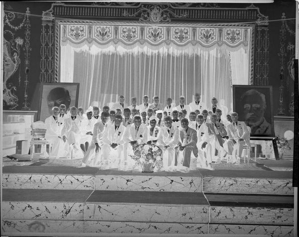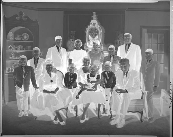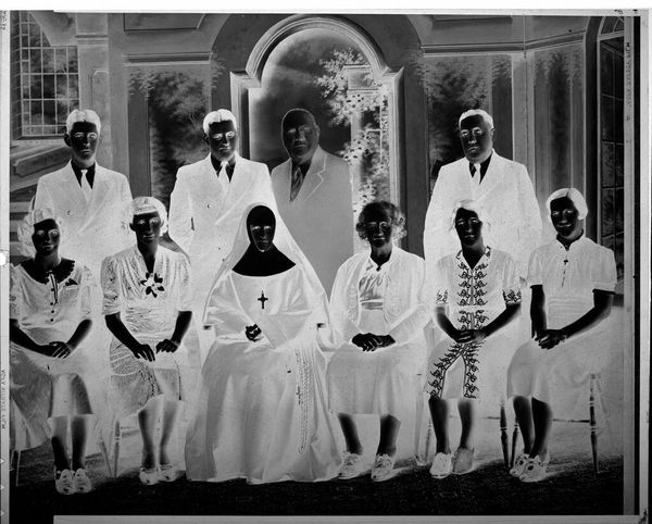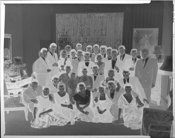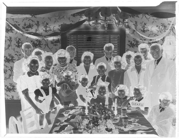 Editor: Here we have Martin Schweig's photograph, "Untitled (large family of eighteen people posing in small room with bookshelf)." It's a black and white image, quite striking in its contrast. I’m curious, what is most interesting to you about this image? Curator: Well, it’s fascinating to consider the social context. Family portraits like these served to solidify status and present a unified image. Who were they trying to impress, and what narratives about themselves were they trying to construct? Notice the bookshelf in the background. What does it tell you about their values and aspirations? Editor: It suggests education and perhaps a certain social standing. What do you mean by who are they trying to impress? Curator: People collect images like these for social capital. Displaying familial bonds, wealth, and status within the constraints of the time period tells a story. It's a performance of identity. Editor: So, it’s not just a family photo, it's a statement? Curator: Precisely! And considering how it was disseminated is key. Was it meant for public display, or private consumption? That shifts its meaning entirely.
