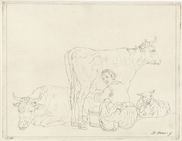 Curator: This captivating drawing, "Figures with Cattle," likely hails from between 1600 and 1700 and is held at the Metropolitan Museum of Art. The artist? Sadly, unknown. Editor: Immediately, I'm struck by this incredible looseness. It's like a daydream sketched on the fly, capturing a serene, rustic moment. Curator: Precisely. Note the almost frenetic quality of the lines. The anonymous artist utilized pen, pencil, and ink to create a flurry of strokes, defining figures and cattle with incredible economy. Editor: The way the lines overlap and intersect—it almost vibrates! It creates depth and a sense of movement within a seemingly static scene. A certain angularity makes the shapes coalesce. Is it me or that resting cattle toward the right seems almost melting? Curator: A keen observation! This stylistic choice, along with the landscape setting and the portrayal of everyday figures, hints at a possible engagement with genre painting— a move toward a kind of honest realism in the art from that period. It feels like someone wanted to portray real people in real time. Editor: Genre is right, it has something documentary... The casual intimacy between the figures and animals suggests a world in balance, doesn't it? It's an unsentimental glimpse into pastoral life. Curator: I find myself wondering about the choices, specifically what’s excluded. Why such an open, undefined background? The focus is clearly on the figures, cattle and their shared space... Was there a goal or was just an improvised piece for some collector? Editor: Maybe the emptiness is intentional, shifting the focus from location to simply existing... Perhaps this work reflects a period that romanticized rural life and an uncomplicated harmony, or just sought to celebrate humble simplicity and its rhythms. Curator: Well, anonymous artist or not, this simple drawing achieves exactly what art should do - ask good questions and connect, regardless of eras. Editor: Right, the sketch leaves a quiet, yet unforgettable reverberation. An unassuming invitation to reflect on life.